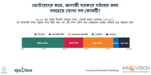 জরিপ বলছে, আওয়ামী লীগের ২০ শতাংশ ভোটার বিএনপিকে, ১৪.৮ শতাংশ জামায়াতকে এবং ২.১ শতাংশ ভোটার এনসিপিকে ভোট দিতে আগ্রহী। এমন পরিস্থিতিতে সরকার গঠনের জন্য যোগ্য দল হিসেবে বিএনপিকে মনে করেন ৩৯.১ শতাংশ ভোটার, জামায়াতকে ২৮.১ শতাংশ এবং এনসিপিকে ৪.৯ শতাংশ ভোটার।